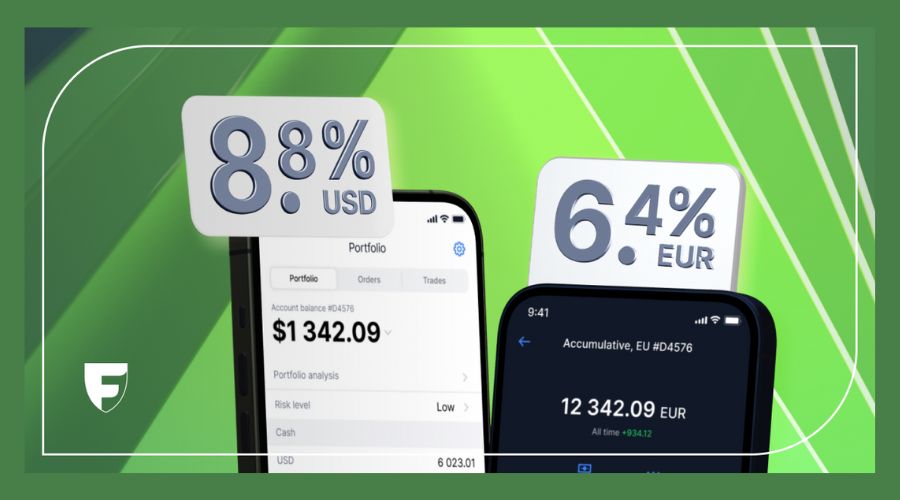 Η απόδοση στα επιτόκια των μακροπρόθεσμων προγραμμάτων αποταμίευσης αυξήθηκε επίσης για καθορισμένη περίοδο 12 μηνών, αγγίζοντας αποδόσεις έως και 1,5 φορά υψηλότερες. Για τα προγράμματα διάρκειας 3 και 6 μηνών, για τον υπολογισμό των τόκων εφαρμόζεται συντελεστής 1,1 και 1,25 στο επιτόκιο SOFR και στο επιτόκιο EURIBOR αντίστοιχα. Επιπλέον, οι επενδυτές μακροπρόθεσμων αποταμιεύσεων κεφαλαίων άνω των 100.000 EUR/USD δικαιούνται επιπλέον μπόνους 0,4% έως 0,8% ετησίως ανάλογα με το νόμισμα και τη διάρκεια του προγράμματος. Έτσι, στις 15 Ιανουαρίου, η μέγιστη απόδοση του προγράμματος μακροπρόθεσμης αποταμίευσης κεφαλαίων της Freedom24, συμπεριλαμβανομένων των μπόνους, ήταν 8,76% για καταθέσεις σε δολάρια και 6,4% για καταθέσεις σε ευρώ. Μέχρι πρότινος, οι επενδυτές που επέλεγαν αυτό το επενδυτικό μέσο λάμβαναν έως και 6,12% για καταθέσεις σε δολάρια και έως 4,21% για καταθέσεις σε ευρώ.