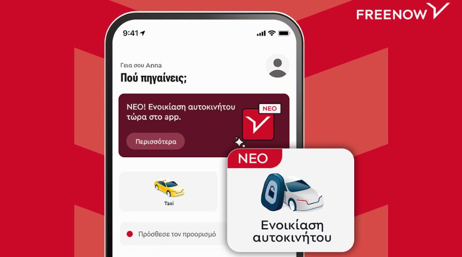 Η FREENOW, το Νο1 Taxi app στην Ελλάδα, εγκαινιάζει τη δυνατότητα ενοικίασης αυτοκινήτου, που είναι πλέον διαθέσιμη για όλους τους χρήστες της εφαρμογής και στις 9 ευρωπαϊκές χώρες όπου λειτουργεί. Με αυτό το βήμα, η FREENOW αναδεικνύει την ισχυρή δέσμευσή της να παρέχει τις καλύτερες και πιο ευέλικτες επιλογές μετακίνησης για κάθε περίσταση.