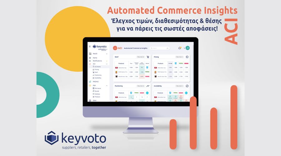 Τη διάθεση -μέσω της καινοτόμου πλατφόρμας της- του ACI (Automated Commerce Insights), ενός αυτοματοποιημένου εργαλείου παρακολούθησης, ανακοινώνει η Keyvoto, μία από τις πλέον καινοτόμες ελληνικές startups στο χώρο του retail tech. Το ACI απαντά σε βασικά ζητήματα, όσον αφορά τα online κανάλια διάθεσης για τα brands και τις εταιρείες που δραστηριοποιούνται στο χώρο του ηλεκτρονικού εμπορίου, συμπεριλαμβανομένου του ελέγχου των τιμών, της διαθεσιμότητας, της επίβλεψης της θέσης στο ψηφιακό «ράφι», συχνών ενημερώσεων και παροχής αναλύσεων για βελτίωση της αποτελεσματικότητας και της αποδοτικότητας των δράσεών τους.