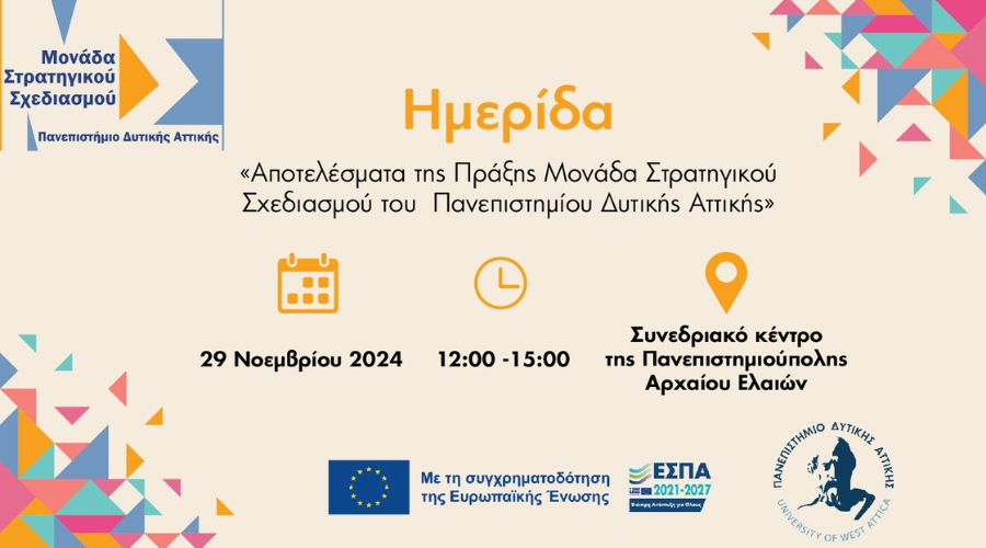 Η Μονάδα Στρατηγικού Σχεδιασμού του Πανεπιστημίου Δυτικής Αττικής διοργανώνει ενημερωτική και απολογιστική ημερίδα με τίτλο «Αποτελέσματα της Πράξης Μονάδα Στρατηγικού Σχεδιασμού του Πανεπιστημίου Δυτικής Αττικής».