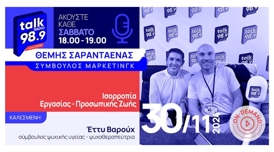 To Σάββατο 30/11/2024 ο σύμβουλος μάρκετινγκ Θέμης Σαρανταένας με καλεσμένη του στο studio του Talk Radio 989 by Alpha τη σύμβουλο ψυχικής υγείας – ψυχοθεραπεύτρια Έττυ Βαρούχ συζήτησαν για την ισορροπία μεταξύ επαγγελματικής και προσωπικής ζωής – μια ισορροπία που συχνά μοιάζει να κινείται σε τεντωμένο σκοινί για πολλούς επιχειρηματίες.