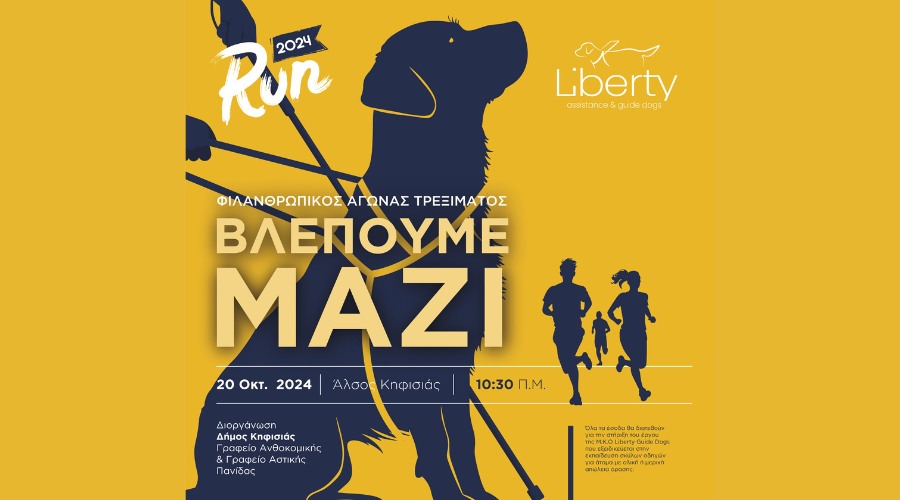 Την Κυριακή 20 Οκτωβρίου, ελάτε να τρέξουμε παρέα με τους τετράποδους φίλους μας στο Άλσος Κηφισιάς, στηρίζοντας το έργο της Liberty Guide Dogs! Ο φιλανθρωπικός αγώνας δρόμου Liberty Run επιστρέφει για 3η συνεχόμενη χρονιά και προσκαλεί μικρούς και μεγάλους να συμμετάσχουν όλοι μαζί για έναν καλό σκοπό. Μην χάσετε την ευκαιρία να γίνετε μέρος αυτής της ξεχωριστής ημέρας αλληλεγγύης και χαράς.