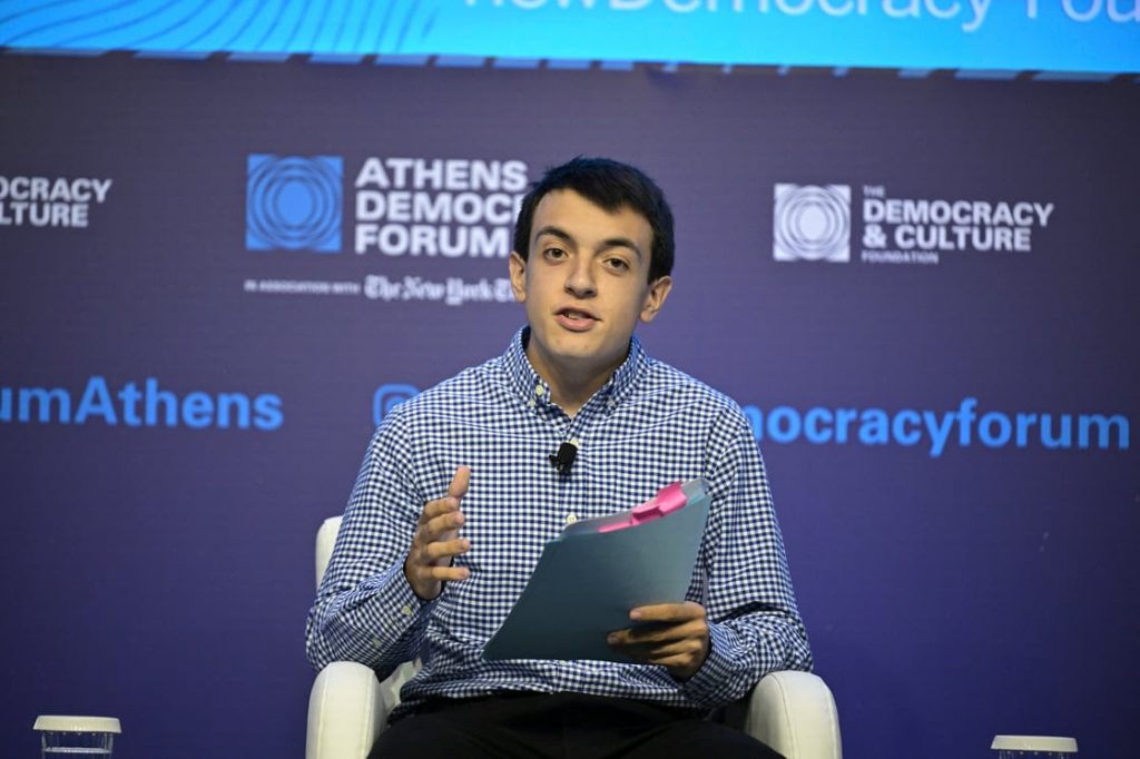 Τις προτάσεις τους για τους τρόπους με τους οποίους οι κυβερνήσεις θα επιτύχουν πιο ενεργή εμπλοκή των νέων στα κοινά κατέθεσαν τέσσερις νέοι από διαφορετικές χώρες προς τέσσερις βουλευτές, στο πλαίσιο του 12ου Athens Democracy Forum που πραγματοποιείται στην Αθήνα από 1 έως 3 Οκτωβρίου 2024, από το Democracy & Culture Foundation σε συνεργασία με τους The New York Times που συντόνιζε η Ελίνα Μακρή, General Manager, Democracy & Culture Foundation.