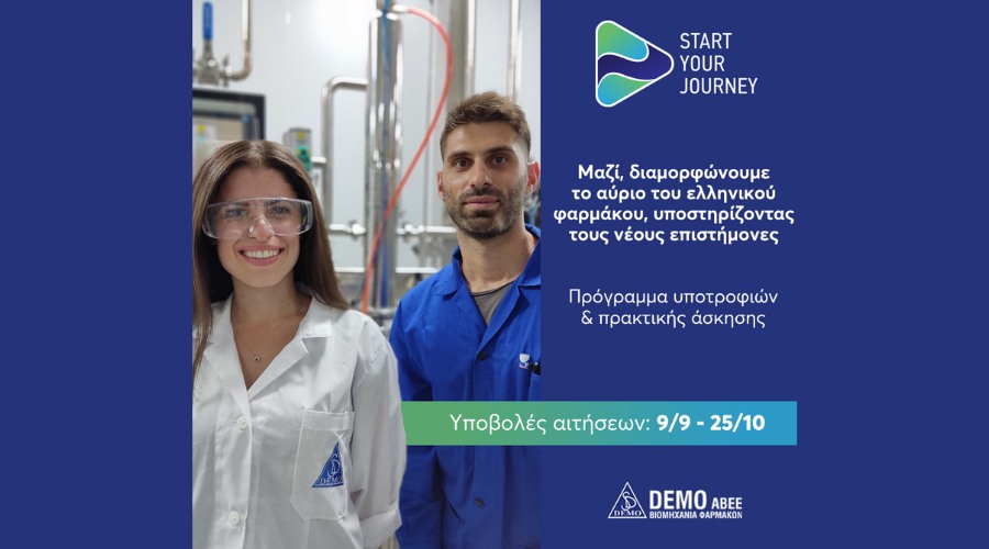 Η DEMO, ηγέτιδα εταιρεία στον κλάδο της φαρμακοβιομηχανίας, ανακοινώνει την έναρξη της περιόδου υποβολής αιτήσεων για τον 7ο κύκλο του Start Your Journey, του Προγράμματος Υποτροφιών και Πρακτικής Άσκησης της εταιρείας, η οποία θα διαρκέσει από τις 9 Σεπτεμβρίου μέχρι 25 Οκτωβρίου 2024.