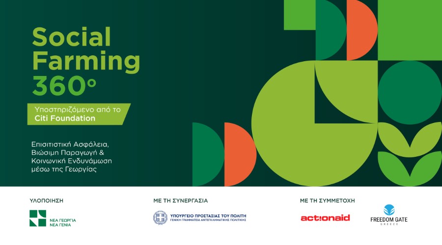 Ο οργανισμός Νέα Γεωργία Νέα Γενιά ανακοινώνει την έναρξη του προγράμματος “Social Farming 360” με χρηματοδότηση και υποστήριξη από το Ίδρυμα Citi, σε άμεση συνεργασία με τη Γενική Γραμματεία Αντεγκληματικής Πολιτικής του Υπουργείου Προστασίας του Πολίτη, και τη συμμετοχή της ActionAid και της Πύλης Ελευθερίας. Στόχος του προγράμματος είναι η  ενίσχυση της επισιτιστικής ασφάλειας, η ανάπτυξη δεξιοτήτων σε ευάλωτες κοινωνικές ομάδες και η ανάπτυξη νέων προϊόντων κοινωνικής γεωργίας.