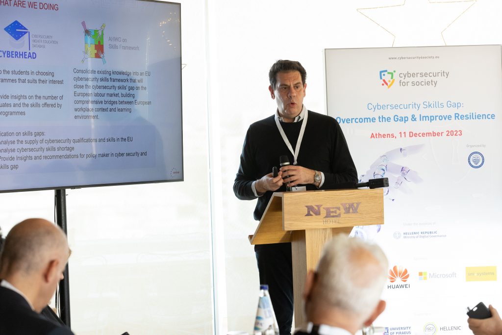 Στη συνέχεια, ο κος. Ιωάννης Αλεξάκης, της Εθνικής Αρχής Κυβερνοασφάλειας, μίλησε για την εθνική προσέγγιση για την κάλυψη του χάσματος των δεξιοτήτων. Τον ακαδημαϊκό κόσμο εκπροσώπησε ο Δρ. Χρήστος Ξενάκης, καθηγητής κυβερνοασφάλειας του τμήματος Ψηφιακών Συστημάτων, του Πανεπιστημίου Πειραιώς, ο οποίος παρουσίασε το whitepaper σχετικά με την έλλειψη cybersecurity skills. Ο κος. Ιωάννης Ηλιάδης, πρόεδρος του ISC2 – Hellenic Chapter, μίλησε για την ανάγκη συνεχούς εκπαίδευσης των εργαζομένων του κλάδου, ενώ ο DPO της κρατικής τηλεόρασης, ΕΡΤ, Δρ. Βασίλης Βασιλόπουλος, ανέλυσε τακτικές ενημέρωσης για την σημασία του κλάδου.