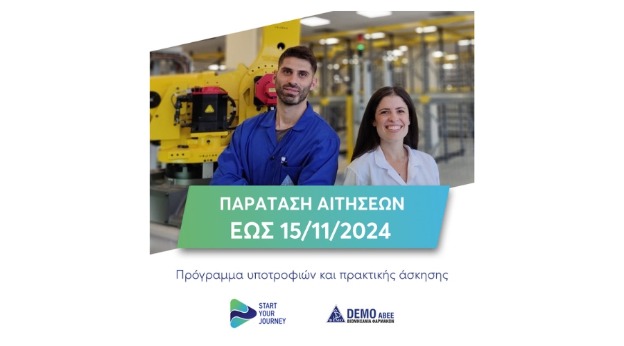 Η DEMO, ηγέτιδα εταιρεία στον κλάδο της φαρμακοβιομηχανίας, ανακοινώνει την παράταση της περιόδου υποβολής αιτήσεων για τον 7ο κύκλο του Start Your Journey, του Προγράμματος Υποτροφιών και Πρακτικής Άσκησης της εταιρείας, μέχρι τις 15 Νοεμβρίου 2024.