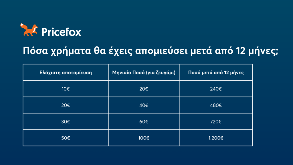 | Ελάχιστη αποταμίευση | Μηνιαίο Ποσό (για ζευγάρι) | Ποσό μετά από 12 μήνες |