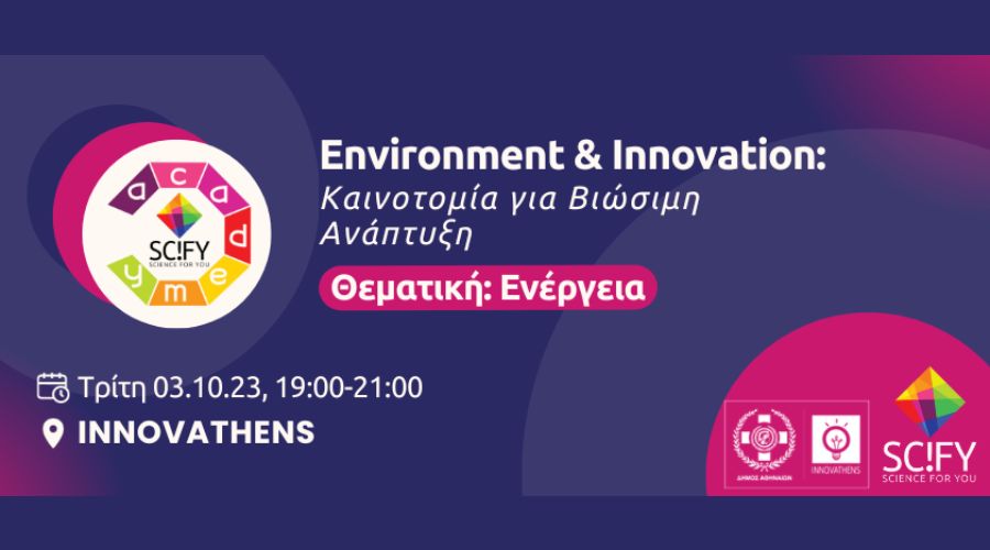 03.10 || SciFY Academy | Environment & Innovation: Καινοτομία για Βιώσιμη Ανάπτυξη | Με θεματική την “Ενέργεια” η SciFY, μέσα από αυτήν την σειρά εκδηλώσεων, φιλοδοξεί να δημιουργήσει μια πλατφόρμα συζήτησης φέρνοντας κοντά εκπροσώπους της πληροφορικής, του περιβάλλοντος και πολίτες. Οι συμμετέχοντες θα έχουν την ευκαιρία να ενημερωθούν για νέες τεχνολογίες, πρακτικά εργαλεία και τρόπους επίτευξης της βιωσιμότητας, τόσο σε επίπεδο κρατών, βιομηχανίας αλλά και ατομικό.