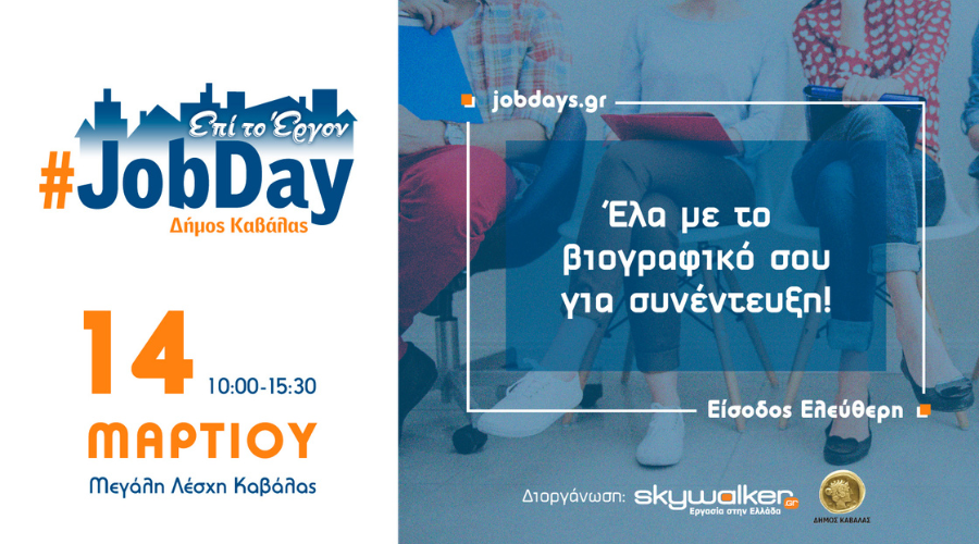 Το skywalker.gr – Εργασία στην Ελλάδα, με την υποστήριξη του Δήμου Καβάλας και του Κέντρου Κοινότητας, διοργανώνει το #JobDay Δήμος Καβάλας, την Παρασκευή 14 Μαρτίου 2025, στη Μεγάλη Λέσχη Καβάλας (Κύπρου 12-14, Καβάλα) και ώρες 10:00-15:30.