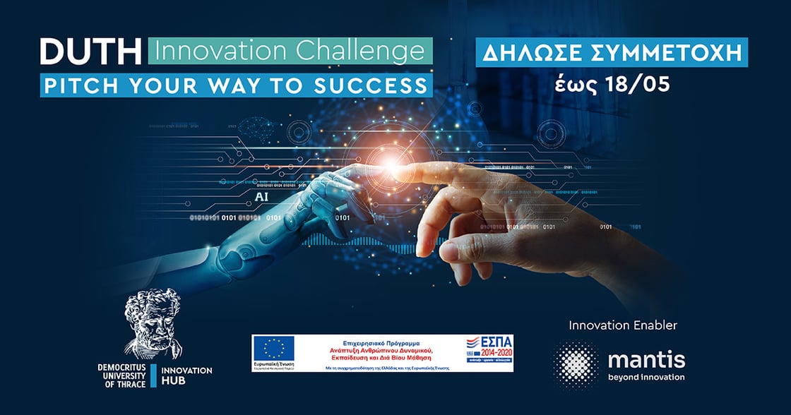 Μετά την επιτυχημένη διοργάνωση του DUTH Idea Accelerator και την επώαση 25 νέων ομάδων από το Δημοκρίτειο Πανεπιστήμιο Θράκης, διοργανώνεται, σε συνεργασία με την Mantis Beyond Innovation, το DUTH Innovation Challenge, ο τριήμερος Διαγωνισμός Καινοτομίας με στόχο την εύρεση, καταγραφή και ανάδειξη καινοτόμων τεχνολογικών ιδεών και εμπορικά αξιοποιήσιμων ερευνητικών αποτελεσμάτων. Ο διαγωνισμός θα διεξαχθεί στις 24-26 Μαΐου, στην Ξάνθη στο Elisso Xenia Hotel και θα μεταδοθεί και διαδικτυακά.