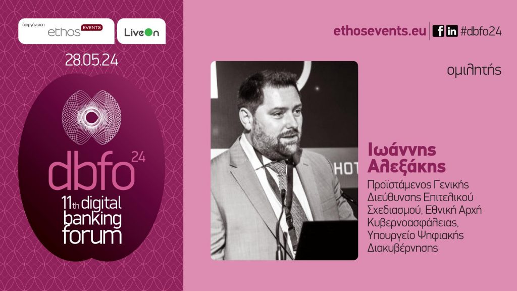 Ο προϊστάμενος της Γενικής Διεύθυνσης Επιτελικού Σχεδιασμού της Εθνικής Αρχής Κυβερνοασφάλειας του Υπουργείου Ψηφιακής Διακυβέρνησης, κ. Ιωάννης Αλεξάκης, πρόκειται να συμμετάσχει, ως κεντρικός ομιλητής, στο 11th Digital Banking Forum στην Ενότητα II, με τίτλο «AI, cloud, κυβερνοασφάλεια και οι λύσεις τεχνολογίας που απαντούν στις νέες ανάγκες». Επίσης, θα παραθέσει ομιλία με θέμα «Κυβερνοασφάλεια και νέες προκλήσεις: Εξελίξεις σε ευρωπαϊκό και εθνικό επίπεδο».