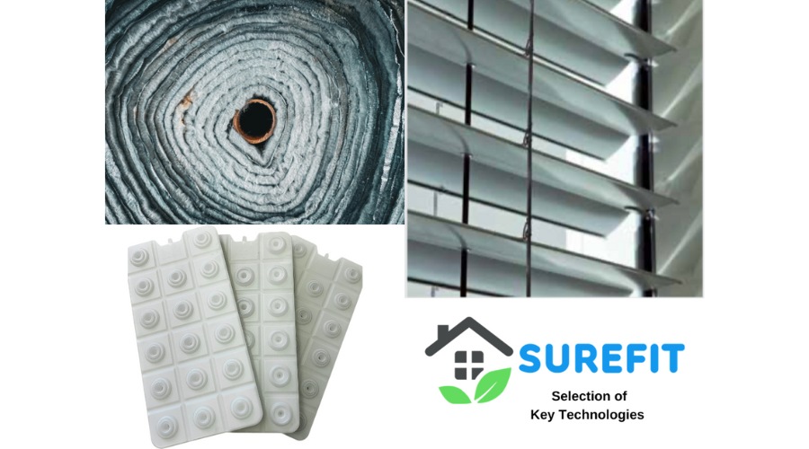 Υλικά Αλλαγής Φάσης: Τα Υλικά Αλλαγής Φάσης (Phase Change Materials/PCMs) είναι υλικά που αποθηκεύουν και απελευθερώνουν θερμότητα κατά τις αλλαγές φάσης, όπως η τήξη και η στερεοποίηση, και χρησιμεύουν ως θερμική μπαταρία. Στα πλαίσια του SUREFIT, χρησιμοποιούνται σε στέγες και παρέχουν άνεση ρυθμίζοντας τη θερμοκρασία εσωτερικών χώρων. Κατά τη διάρκεια της ημέρας, τα ΥΑΦ απορροφούν και αποθηκεύουν την περισσευούμενη υψηλή θερμότητα, διατηρώντας τη θερμοκρασία του δωματίου σταθερή, και τη νύχτα, καθώς πέφτουν οι θερμοκρασίες, απελευθερώνουν την αποθηκευμένη θερμότητα, διατηρώντας μια σταθερή άνετη εσωτερική θερμοκρασία. Αυτή η διαδικασία μειώνει την ανάγκη για ενεργή θέρμανση και ψύξη.