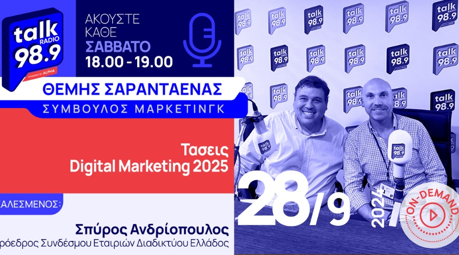 Τη συγκεκριμένη εκπομπή (Νο 3) «Τασεις Digital Marketing 2025» μπορείτε να την ακούσετε εδώ: marketingconsultant.gr/taseis-digital-marketing-2025-talk-radio-989/