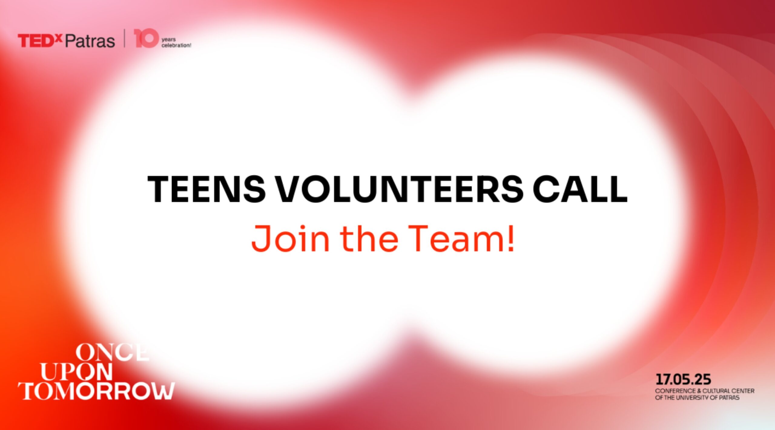 Για δεύτερη φορά, το πρόγραμμα Teens Volunteers του TEDxPatras δίνει τη δυνατότητα σε νέους και νέες να ζήσουν από μέσα την εμπειρία ενός TEDx event. Οι έφηβοι εθελοντές/-ντριες θα συμμετέχουν ενεργά στην προετοιμασία και την υλοποίηση της διοργάνωσης, θα γνωρίσουν επαγγελματίες από διαφορετικούς κλάδους, θα αναπτύξουν πολύτιμες δεξιότητες και – το σημαντικότερο – θα γίνουν μέρος μιας μοναδικής κοινότητας.