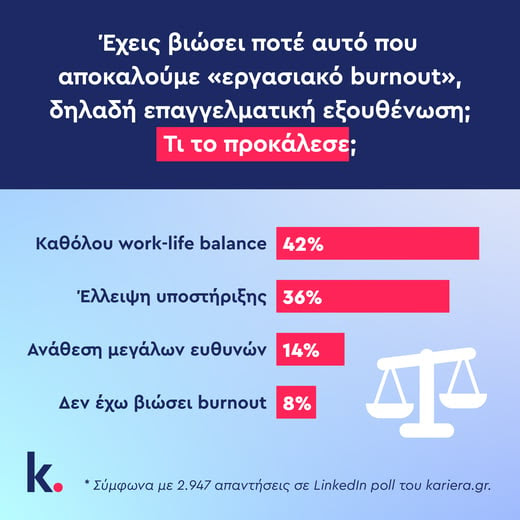 Ερωτηθέντες για το αν έχουν βιώσει burnout και τι το προκάλεσε, 42% των ερωτηθέντων απαντούν “καθόλου work-life balance”, 36% επισημαίνει την έλλειψη υποστήριξης, 14% την ανάθεση μεγάλων ευθυνών, ενώ μόλις 8% λέει πως δεν έχει βιώσει burnout. (2.947 απαντήσεις συνολικά)