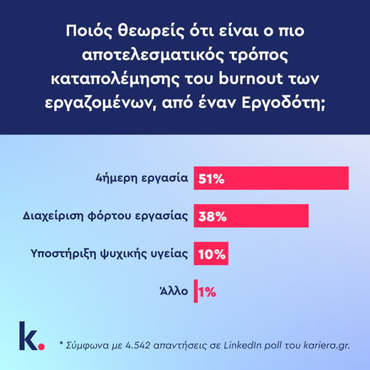 Για την καταπολέμηση του burnout, περισσότεροι από τους μισούς ερωτηθέντες θεωρούν την 4ήμερη εργασία τον πιο αποδοτικό τρόπο αντιμετώπισης από τον εργοδότη, ενώ 38% βρίσκει πως θα ήταν χρήσιμη η διαχείριση του φόρτου εργασίας και μόλις 10% η υποστήριξη της ψυχικής υγείας. (4.542 απαντήσεις συνολικά)