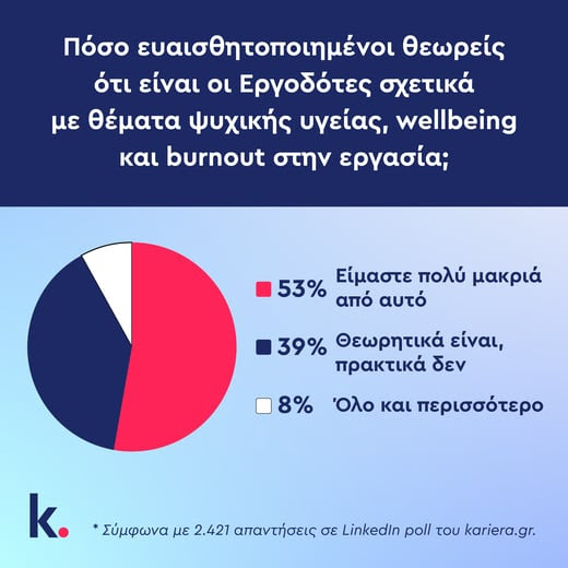 Ερωτηθέντες σχετικά με το πόσο ευαισθητοποιημένους θεωρούν τους εργοδότες απέναντι στο burnout, το wellbeing και θέματα ψυχικής υγείας στην εργασία, μόλις 8% απαντούν “όλο και περισσότερο”, ενώ περισσότεροι από τους μισούς (53%) απαντούν πως είμαστε πολύ μακριά από αυτό. Μάλιστα αν προσθέσουμε σε αυτό και τις…χλιαρές απαντήσεις (“θεωρητικά ναι, πρακτικά δεν”) με 39%, διαπιστώνουμε ότι σε συντριπτικό ποσοστό 92% οι Έλληνες εργαζόμενοι πιστεύουν ότι οι εργοδότες δεν αντιλαμβάνονται πραγματικά τι συμβαίνει με την ψυχολογία τους. (2.421 απαντήσεις συνολικά)