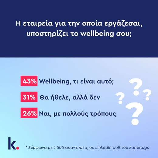Σε ερώτηση, δε, σχετικά με το αν η εταιρεία που δουλεύουν υποστηρίζει το wellbeing τους, πάνω από 70% απαντούν αρνητικά. 43% απαντά “wellbeing, τι είναι αυτό;” ενώ 31% επισημαίνει την καλή πρόθεση χωρίς αποτέλεσμα, επιλέγοντας “θα ήθελε, αλλά δεν”. Παρ’όλα αυτά είναι θετικό ότι σε ποσοστό 26% απαντούν πως υποστηρίζεται με πολλούς τρόπους. (1.505 απαντήσεις συνολικά)