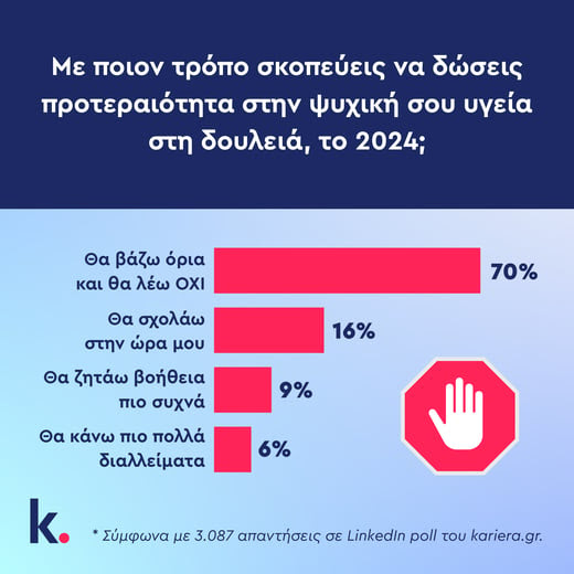 Αναφορικά με την προτεραιοποίηση της ψυχικής τους υγείας στη δουλειά, οι ερωτηθέντες υπογράμμισαν την ανάγκη οριοθέτησης. “Θα θέτω όρια και θα λέω ΟΧΙ”, απάντησαν σε ποσοστό 70%, ενώ ακολούθησαν σε 16% το να φεύγουν στην ώρα τους, σε 9% να ζητούν βοήθεια πιο συχνά και σε 6% να κάνουν πιο συχνά διαλείμματα. (3.087 απαντήσεις συνολικά)