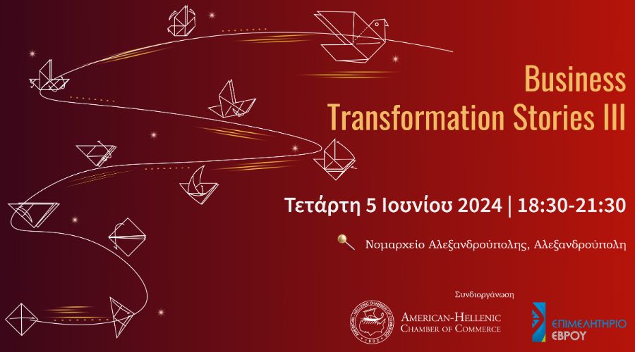 Το  Ελληνο-Αμερικανικό Εμπορικό Επιμελητήριο (ΕΑΕΕ) σε συνεργασία με το Επιμελητήριο Έβρου, διοργανώνει την τρίτη εκδήλωση της σειράς με τίτλο «Business Transformation Stories ΙΙΙ» την Τετάρτη 5 Ιουνίου 2024, στην Νομαρχία Αλεξανδρούπολης και ώρα 18:30.