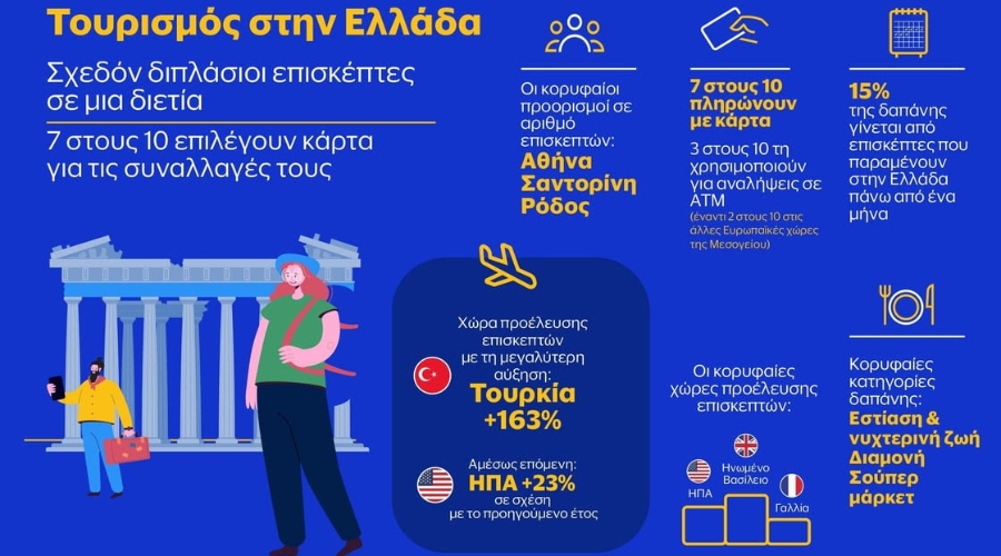 Σύμφωνα με την ανάλυση, ο τουρισμός στην Ελλάδα παρουσίασε ισχυρή ανάκαμψη μετά την πανδημία, σημειώνοντας αύξηση 97% σε σύγκριση με το 2021. Βάσει του μνημονίου συνεργασίας που υπεγράφη ανάμεσα στη Visa και στην Ελληνική Κυβέρνηση τον Μάρτιο του 2022, η Visa παρέχει στο Υπουργείο Τουρισμού συγκεντρωτικά δεδομένα με στόχο να διευκολύνει την κατανόηση των τάσεων στον τουρισμό και τη λήψη εμπεριστατωμένων αποφάσεων για την προσέλκυση περισσότερων και καλύτερα στοχευμένων επισκεπτών αλλά και την παροχή σε αυτούς καλύτερων εμπειριών.