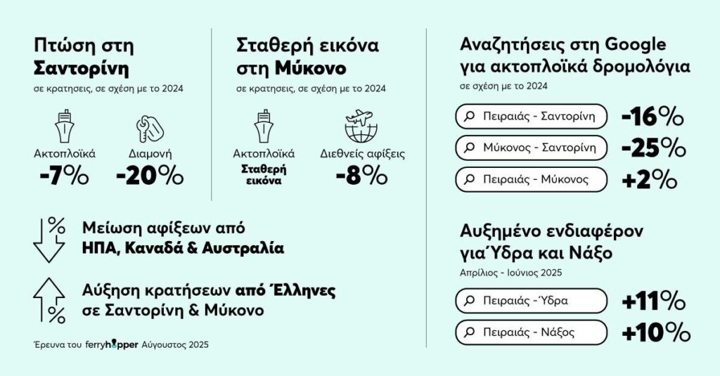 Σε αυτά τα δεδομένα συνηγορεί και η πρόσφατη ανάλυση του Ferryhopper με βάση τις αναζητήσεις στη Google, σύμφωνα με την οποία οι αναζητήσεις σχετικές με “Πειραιάς – Σαντορίνη” και “Μύκονος-Σαντορίνη” μειώθηκαν -16% και -25% αντίστοιχα, σε σχέση με την περσινή αντίστοιχη περίοδο. Οι αναζητήσεις σχετικές με το ταξίδι “Πειραιάς – Μύκονος” καταγράφουν οριακή αύξηση σε σχέση με το 2024, στο +2%