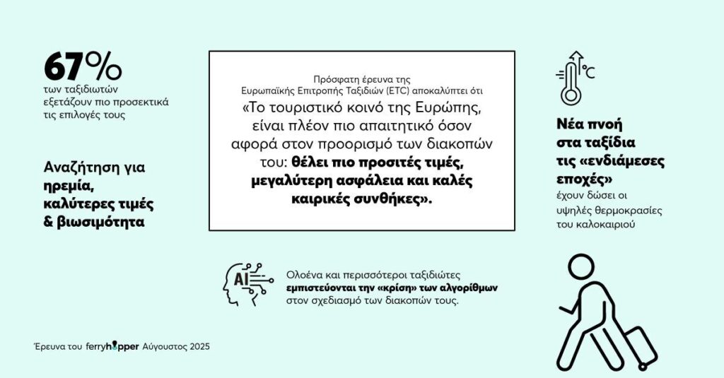 Παράλληλα, έρευνες της Google δείχνουν ότι η σχέση ποιότητας-τιμής παραμένει βασική προτεραιότητα για τους ταξιδιώτες. Το 67% των ταξιδιωτών μελετά προσεκτικά τις λεπτομέρειες όταν σχεδιάζει τις διακοπές του, με το 61% να υπογραμμίζει ότι η λήψη αυτών των αποφάσεων είναι σήμερα πιο περίπλοκη και απαιτητική σε σύγκριση με το παρελθόν. Επιπλέον, σημαντική είναι και η επίδραση της τεχνητής νοημοσύνης, με ολοένα και περισσότερους ταξιδιώτες να εμπιστεύονται την «κρίση» των αλγορίθμων στο σχεδιασμό των διακοπών τους.