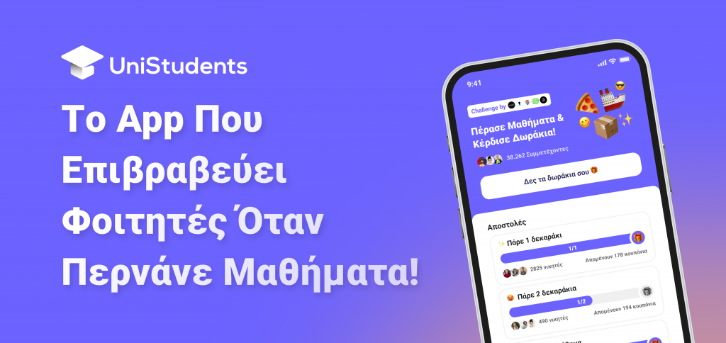 Λίγο πριν την καλοκαιρινή εξεταστική περίοδο, η ομάδα του UniStudents λάνσαρε τη νέα της λειτουργία, τα UniChallenges! Σε συνεργασία με Brands, το UniStudents βάζει Challenges στου φοιτητές για τη περίοδο της εξεταστικής (πχ. πέρασε 4 μαθήματα, γράψε δέκα σε ένα μάθημα κλπ) και τους επιβραβεύει με δωράκια όταν τα καταφέρνουν.