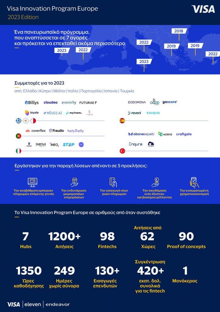 Σχεδιασμένο για να αποτελέσει μια βάση εκκίνησης για τα νέα ταλέντα στο χώρο του fintech, το Visa Innovation Program Europe επιταχύνει την ανάπτυξη των εταιρειών του κλάδου παρέχοντας πρόσβαση στο παγκόσμιο δίκτυο των επιχειρηματικών συνεργατών της Visa. Ακόμα, διευκολύνει την ανταλλαγή γνώσεων και την υλοποίηση καινοτόμων λύσεων στον τομέα των πληρωμών αλλά και στη δημιουργία ενός έξυπνου και βιώσιμου μέλλοντος. Το Πρόγραμμα αναπτύσσεται, στην παρούσα φάση, σε επτά χώρες στην Ευρώπη – Ελλάδα, Κύπρο, Μάλτα, Τουρκία, Ισπανία, Πορτογαλία και Ιταλία. Στο Visa Innovation Program Europe συμπεριλαμβάνονται σχεδόν 100 εταιρείες, που αποφοίτησαν από το Πρόγραμμα και ένα εκτεταμένο δίκτυο με περισσότερους από 200 επιχειρηματικούς εταίρους – εμπόρους, neobanks, παρόχους BaaS, κολοσσούς του ηλεκτρονικού εμπορίου και εταιρείες εφοδιαστικής αλυσίδας που συνεργάζονται στον χώρο της καινοτομίας. Μέσα στα χρόνια, 90 πιλοτικές ή εμπορικές ιδέες ολοκληρώθηκαν.