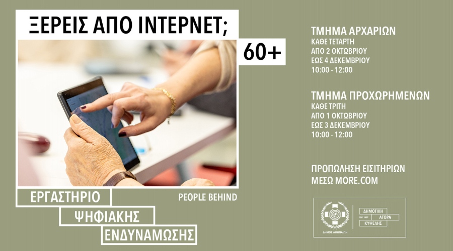 Προωθώντας την ψηφιακή εκπαίδευση και ενσωμάτωση για όλους, η Δημοτική Αγορά Κυψέλης παρουσιάζει από τον Οκτώβριο έως τον Δεκέμβριο τον νέο κύκλο του workshop «Ξέρεις από ίντερνετ;» για άτομα ηλικίας άνω των 60 ετών, σε συνεργασία με τον μη κερδοσκοπικό οργανισμό People Behind.
