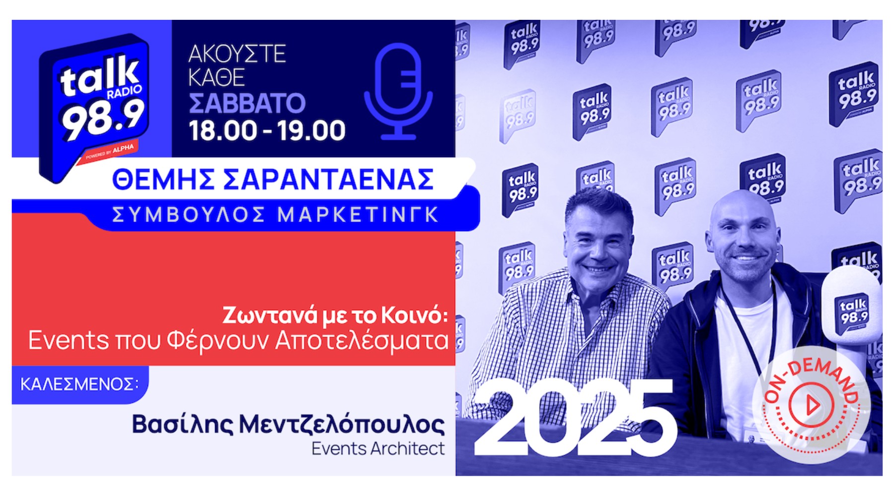 Ο σύμβουλος μάρκετινγκ Θέμης Σαρανταένας με καλεσμένο του στο studio του Talk Radio 989 by Alpha τον Events Architect Βασίλη Μεντζελόπουλο συζήτησαν για ένα από τα πιο δυνατά εργαλεία marketing που πολλές μικρές επιχειρήσεις είτε υποτιμούν είτε φοβούνται να δοκιμάσουν: τα events.