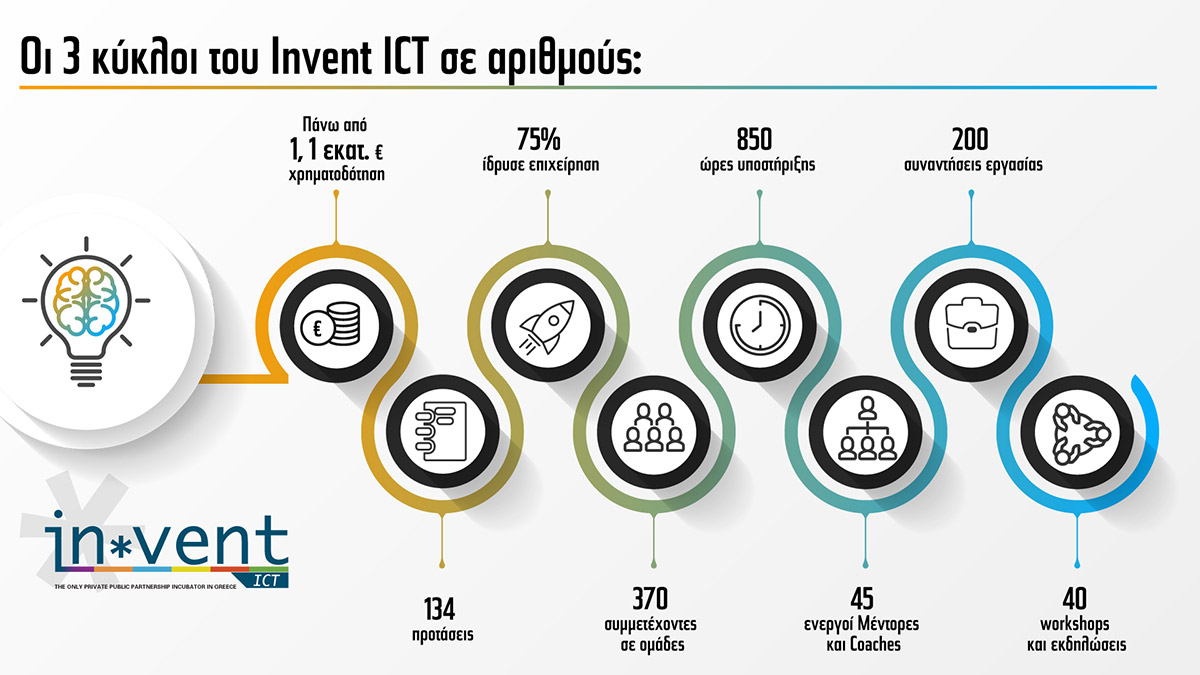 Ενθαρρυντικός είναι ο απολογισμός του προγράμματος υποστήριξης της καινοτομίας και των νεοφυών επιχειρήσεων «INVENT ICT», μετά την ολοκλήρωση του τρίτου κύκλου, καθώς το 75% των συμμετεχόντων έχει καταφέρει να ιδρύσει επιχείρηση, δημιουργώντας νέες υπεραξίες και καινούργιες θέσεις εργασίας.