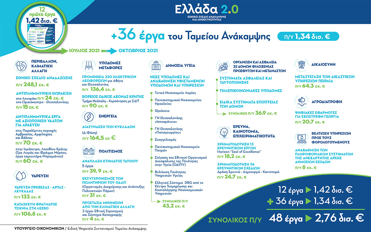 Από κοινού με τα 12 πρώτα έργα 1,42 δισ. ευρώ που ανακοινώθηκαν τον Ιούλιο, οι εντάξεις του Ταμείου αριθμούν σήμερα 48 έργα, με προϋπολογισμό 2,76 δισ. ευρώ.