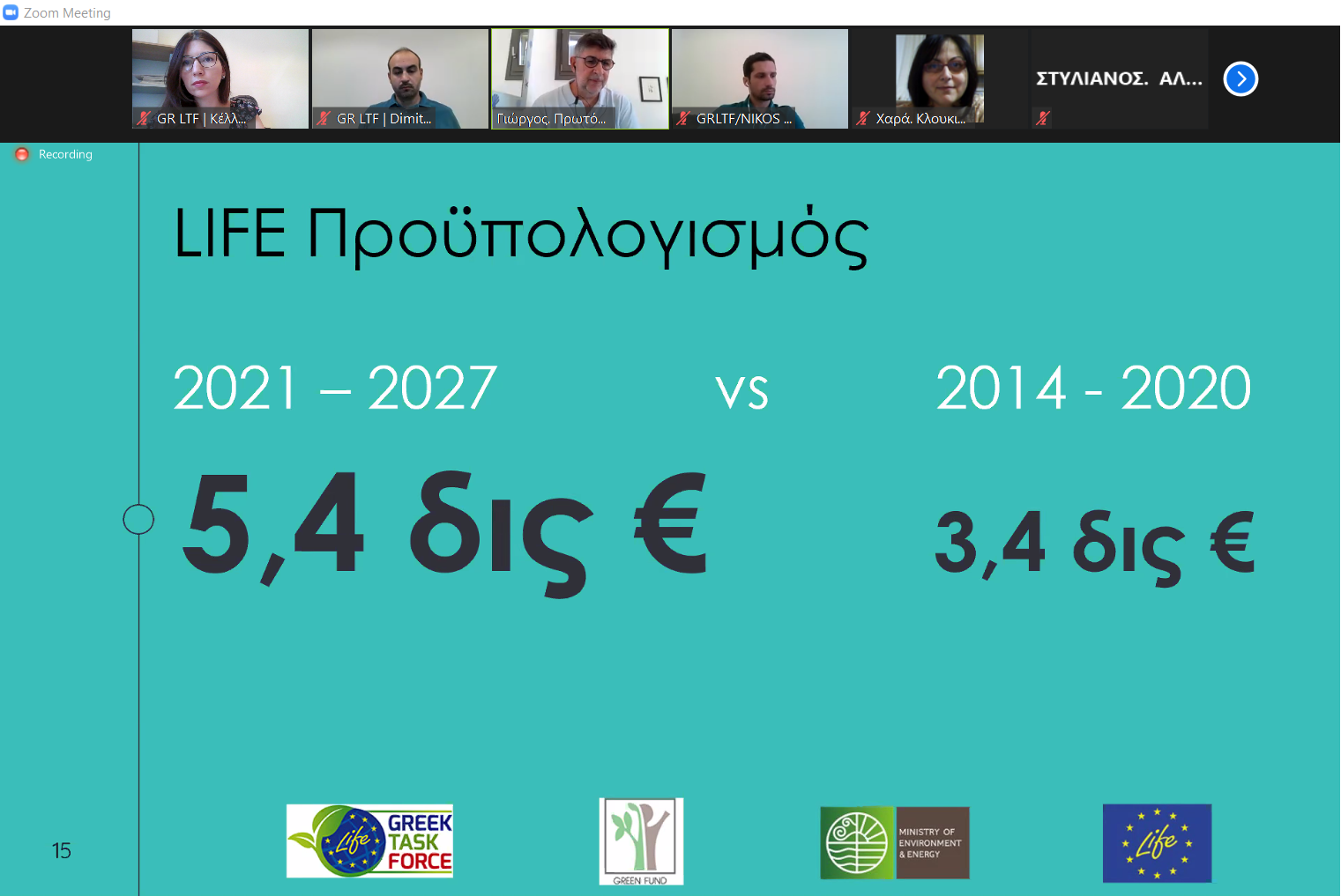 Στο πλαίσιο της δημοσίευσης της νέας Πρόσκλησης LIFE 2021 και της επιτυχούς ολοκλήρωσης του έργου Οικοδόμησης Δυναμικού «Ίδρυση και Λειτουργία της Ελληνικής Task Force για το Πρόγραμμα LIFE» – GR LTF (LIFE14 CAP/GR/000003) τέλος Ιουλίου μετά από πέντε χρόνια υλοποίησης, διοργανώθηκε στις 15 Ιουλίου 2021 η Διαδικτυακή Εκδήλωση: «Βασικά Σημεία της Νέας Προγραμματικής Περιόδου 2021-2027 για το Πρόγραμμα LIFE/Τελικό Συνέδριο & Διεθνές Workshop της Greek LIFE Task Force» από την GR LTF, το Πράσινο Ταμείο και το Υπουργείο Περιβάλλοντος και Ενέργειας.