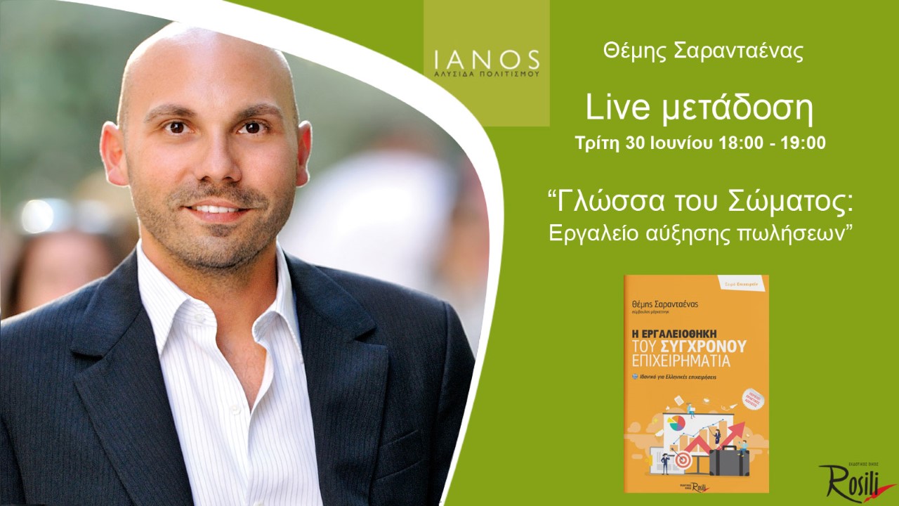 Την Τρίτη 30 Ιουνίου και ώρα 18:00 – 19:00 οι εκδόσεις Rosili παρουσιάζουν σε συνεργασία με την Αλυσίδα Πολιτισμού ΙΑΝΟS τη δωρεάν online ομιλία με θέμα «Γλώσσα του σώματος: εργαλείο αύξησης των πωλήσεων» με εισηγητή το σύμβουλο μάρκετινγκ Θέμη Σαρανταένα.