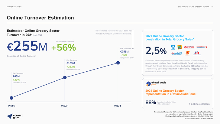 Αλματώδεις ρυθμούς ανάπτυξης κατέγραψε το 2021 ο κλάδος των online σουπερμάρκετ στην Ελλάδα. Η αξία των online πωλήσεων άγγιξε τα €255 εκατ. σε τιμές λιανικής συμπεριλαμβανομένου του ΦΠΑ, αυξημένη κατά 56% σε σχέση με το 2020.