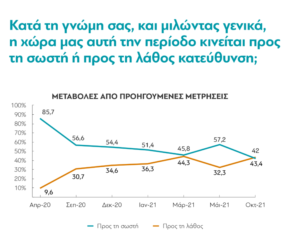 Οι Έλληνες πολίτες, δε, είναι πλέον μοιρασμένοι σε δυο κατηγορίες: οι μισοί πιστεύουν ότι η χώρα μας πηγαίνει προς τη σωστή κατεύθυνση, ενώ οι υπόλοιποι πιστεύουν το αντίθετο. Ωστόσο, δεν είναι το ίδιο μοιρασμένες όλες οι υποομάδες του πληθυσμού. Ένας σημαντικός παράγοντας που διαφοροποιεί το αποτέλεσμα είναι η ηλικία: οι πολίτες ηλικίας άνω των 65 που πιστεύουν ότι πάμε προς τη σωστή κατεύθυνση είναι υπερδιπλάσιοι από τους συνομηλίκους τους που πιστεύουν το αντίθετο. Στις ηλικίες 17-39, όμως, τα ποσοστά είναι ακριβώς ανάποδα. Η στάση των νεότερων είναι γενικά πιο απαισιόδοξη για σχεδόν όλα τα θέματα της πανδημίας, κάτι που επιβεβαιώνεται και από άλλες έρευνες και για άλλα θέματα, και αξίζει περαιτέρω διερεύνηση. Αξίζει επίσης να αναφέρουμε ότι οι μισοί εμβολιασμένοι πολίτες πιστεύουν ότι πάμε προς τη σωστή κατεύθυνση, ενώ 7 στους 10 ανεμβολίαστους πιστεύουν ότι πηγαίνουμε προς τη λάθος.