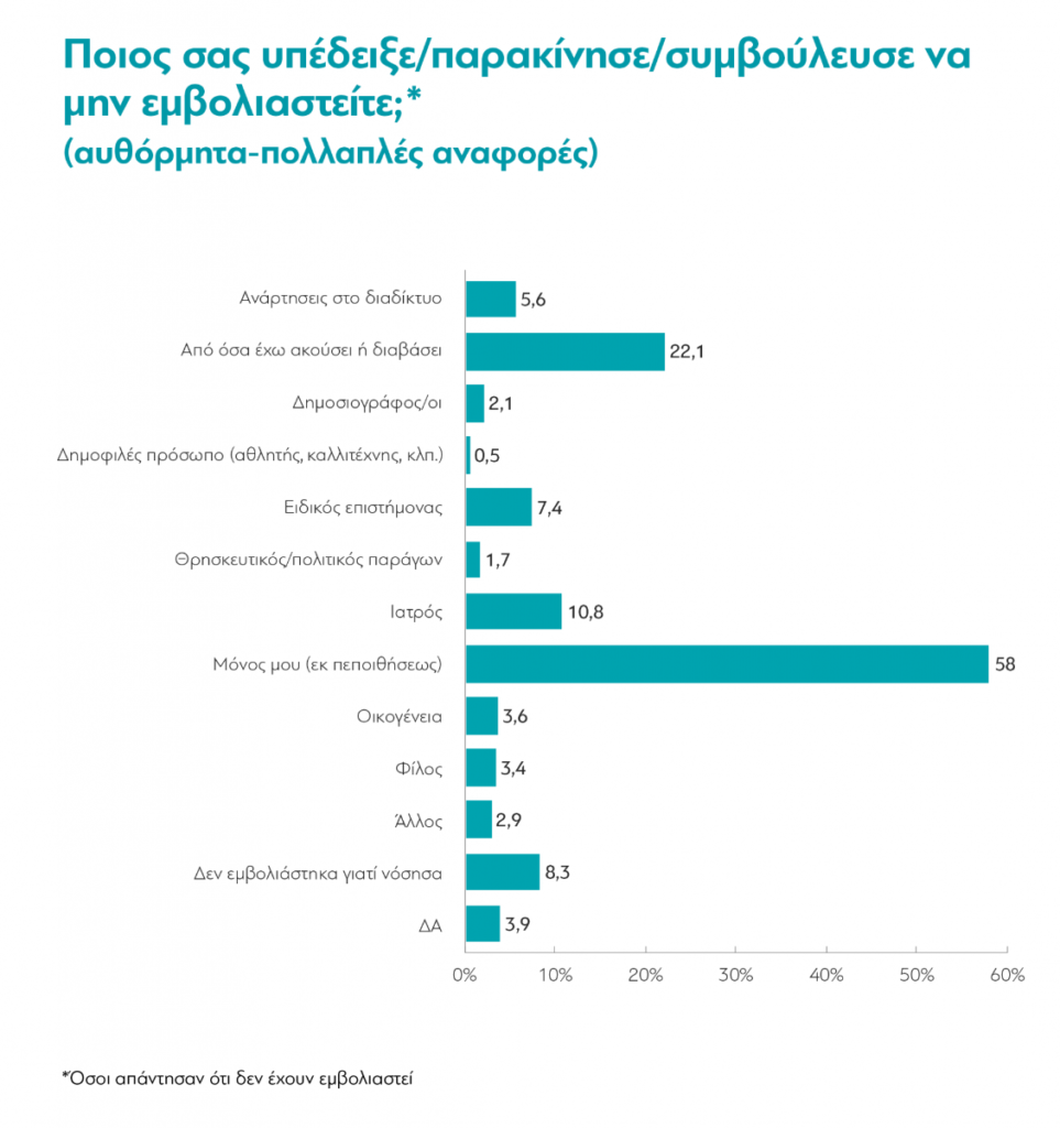Αντίστοιχα στους ανεμβολίαστους (που είναι το 23% του συνόλου), ίδιο ποσοστό (58%) δηλώνουν πως μόνοι ή μόνες αποφάσισαν να μην εμβολιαστούν. 1 στους 5 λέει ότι επηρεάστηκε “από όσα έχει διαβάσει ή ακούσει” και μόνο 1 στους 10 επειδή παρακινήθηκε να μην εμβολιαστεί από τον γιατρό του. Από αυτό το 23%, πάντως, περίπου οι μισοί δηλώνουν ότι εξαρχής είχαν αποφασίσει να μην εμβολιαστούν, ενώ οι άλλοι μισοί ότι σκόπευαν να εμβολιαστούν, και άλλαξαν γνώμη.