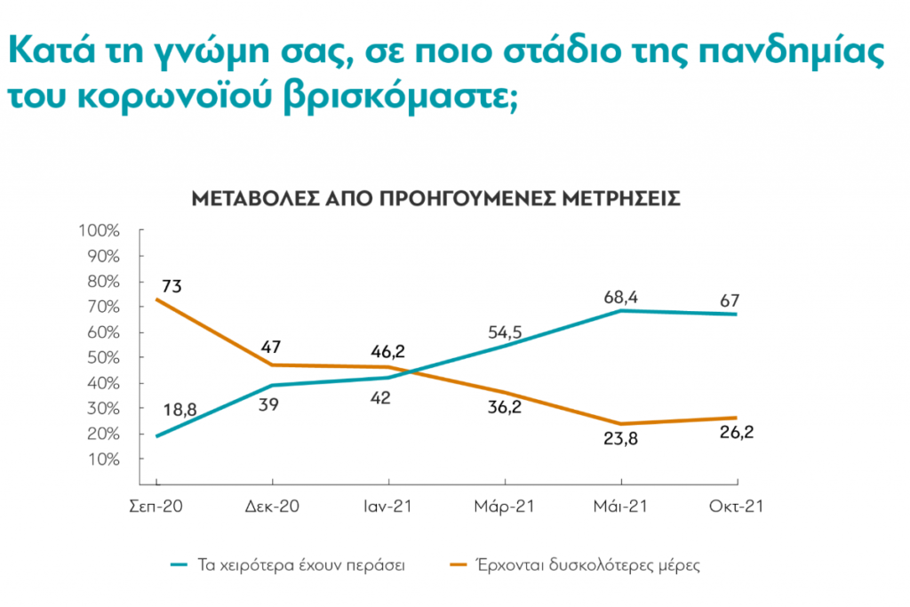 Από την αρχή της πανδημίας του νέου κορωνοϊού, η διαΝΕΟσις παρακολουθεί και μελετά τις εκφάνσεις και τις συνέπειες του φαινομένου και της κρίσης στην οικονομία και στην κοινωνία της χώρας μας. Πέρα από τα άρθρα και τις αναλύσεις, από τον Απρίλιο του 2020 ξεκινήσαμε και μια σειρά από έρευνες κοινής γνώμης, προσπαθώντας να αποτυπώσουμε τις στάσεις και τις απόψεις των πολιτών και να χαρτογραφήσουμε το πώς αυτές αλλάζουν στις διάφορες φάσεις της πανδημίας. Η χαρτογράφηση ξεκίνησε από το “σκληρό” καθολικό lockdown στην αρχή, πέρασε από το δύσκολο φθινόπωρο και τον χειμώνα του ’20, μετά από την έλευση των εμβολίων, συνεχίστηκε στο “άνοιγμα” της άνοιξης του ’21 και, πλέον, σε μια νέα πραγματικότητα -και μια νέα έξαρση κρουσμάτων- εδώ στα τέλη του 2021, ολοκληρώνεται με μια νέα έρευνα, την έβδομη κατά σειρά.