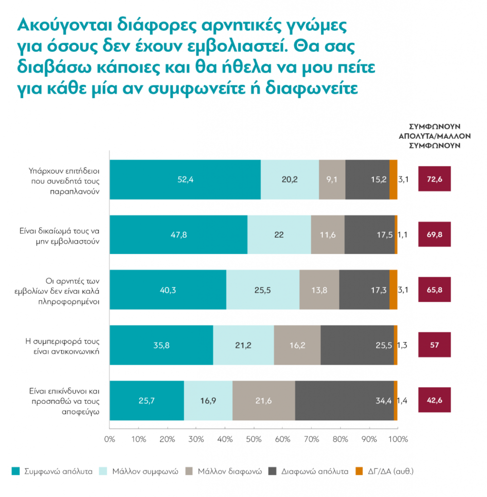 7 στους 10 εμβολιασμένους πιστεύουν ότι οι ανεμβολίαστοι συμπολίτες τους “δεν είναι καλά πληροφορημένοι” και ότι “υπάρχουν επιτήδειοι που συνειδητά τους παραπλανούν“. 6 στους 10 υποστηρίζουν ότι “η συμπεριφορά τους είναι αντικοινωνική” και 4 στους 10 ότι “είναι επικίνδυνοι και προσπαθούν να τους αποφεύγουν”. Ταυτόχρονα, όμως, 7 στους 10 εμβολιασμένους πιστεύουν ότι το να μην εμβολιαστούν οι ανεμβολίαστοι “είναι δικαίωμά τους”.