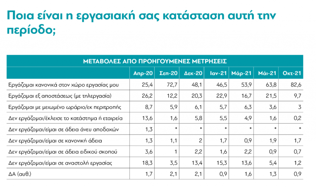 1. Μέχρι την ώρα που γράφονται αυτές οι γραμμές και εδώ και μερικούς μήνες, ένα επίπεδο κανονικότητας έχει επανέλθει στην καθημερινή ζωή, κάτι που αποτυπώνεται και στο πώς δουλεύουν οι Έλληνες. Τον Απρίλιο του 2020 μόνο 1 στους 4 Έλληνες εργαζόταν κανονικά στον χώρο εργασίας του -άλλος 1 στους 4 εργαζόταν με τηλεργασία και οι υπόλοιποι βρίσκονταν σε κάποια μορφή αναστολής εργασίας ή άδειας. Σήμερα το 83% των εργαζομένων δουλεύουν, πια, κανονικά στον χώρο εργασίας τους και μόνο το 10% εργάζονται πλέον με τηλεργασία.