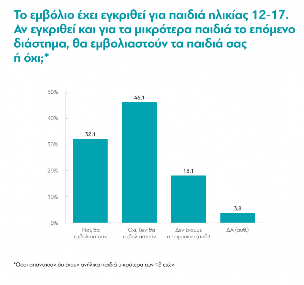 Ενδιαφέρον επίσης παρουσιάζουν και οι στάσεις των Ελλήνων ως προς τον εμβολιασμό των παιδιών. Τον Μάιο του 2021, λίγο πριν ο ΕΜΑ εγκρίνει τη χρήση του εμβολίου για τα παιδιά ηλικίας 12 ετών και άνω στην Ευρώπη, το 58,1% των Ελλήνων γονέων δήλωναν πως δεν θα εμβολίαζαν τα παιδιά τους. Σήμερα, όμως, 6 στους 10 γονείς παιδιών ηλικίας άνω των 12 ετών δηλώνουν ότι τα παιδιά τους είτε έχουν ήδη εμβολιαστεί (38%) είτε ότι πρόκειται να εμβολιαστούν (20%). Σήμερα, δε, από τους γονείς παιδιών ηλικίας κάτω των 12, μόνο 1 στους 3 δηλώνει ότι τα παιδιά του θα εμβολιαστούν όταν εγκριθεί το εμβόλιο και γι’ αυτά. 1 στους 5 δηλώνει ότι δεν έχει αποφασίσει ακόμη, και σχεδόν οι μισοί (46%) ότι τα παιδιά τους δεν θα εμβολιαστούν. Σημειώνουμε ότι την ώρα που γράφονται αυτές οι γραμμές το εμβόλιο για παιδιά ηλικίας 5-11 έχει εγκριθεί στις ΗΠΑ, ενώ η σχετική απόφαση του ΕΜΑ για τις χώρες της ΕΕ αναμένεται τις επόμενες εβδομάδες.