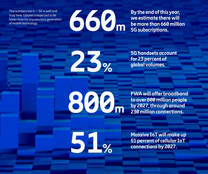 Με ορίζοντα το 2027, το 5G θα καλύπτει το 75% του παγκόσμιου πληθυσμού, μεταφέροντας το 62% της παγκόσμιας κίνησης των smartphones. Η αυξημένη διείσδυση της νέας γενιάς δικτύων μέχρι τα τέλη του τρέχοντος έτους οφείλεται στη μεγαλύτερη από την αναμενόμενη ζήτηση στην Κίνα και τη Βόρεια Αμερική, η οποία οφείλεται με τη σειρά της – εν μέρει – στις συνεχώς μειούμενες τιμές των συσκευών 5G.