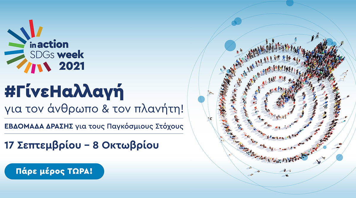 Η ΕΛΛΗΝΙΚΗ ΕΒΔΟΜΑΔΑ ΔΡΑΣΗΣ, in Action SDGs Week 2021, μέρος της παγκόσμιας καμπάνιας του ΟΗΕ, καλεί Όλους -Θεσμικούς Φορείς, Επιχειρήσεις, Ακαδημαϊκή Κοινότητα, Οργανισμούς της  Τοπικής Αυτοδιοίκησης και της Κοινωνίας Πολιτών- μαζί με την Σχολική Κοινότητα και τους Ενεργούς Πολίτες να αρθρώσουμε μια ενιαία ισχυρή φωνή, μοιραζόμενοι ιδέες και μετασχηματιστικές λύσεις, συνεργαζόμενοι για να δείξουμε ότι υπάρχει ελπίδα στην μετά covid εποχή.
