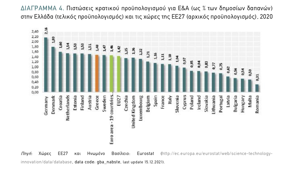 Πιο συγκεκριμένα, το 2020, οι πιστώσεις του κρατικού προϋπολογισμού για Ε&Α στην Ελλάδα αποτελούν το 0,89% του ΑΕΠ και την κατατάσσουν πλέον στην 3η θέση στην Ε.Ε. των 27, πάνω από τον Μ.Ο. της Ευρώπης των 27 (0,67%) αλλά και της Ευρωζώνης (0,69%).
