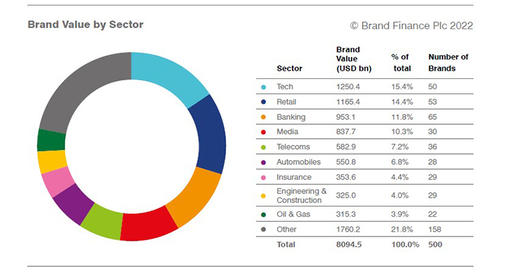 Τη δυναμική του να δημιουργεί υπεραξίες επιβεβαιώνει ο κλάδος της τεχνολογίας, ο οποίος παράγει σήμερα τα πιο πολύτιμα brands του πλανήτη. Σύμφωνα με το “Brand Finance Global 500, 2022”, η Apple παραμένει σήμερα το πιο “ακριβό” brand στον κόσμο, με αποτίμηση ρεκόρ που υπερβαίνει τα $355 δισ. Μάλιστα, η αποτίμηση αυτή είναι η υψηλότερη, που έχει καταγραφεί ποτέ στο “Brand Finance Global 500”.