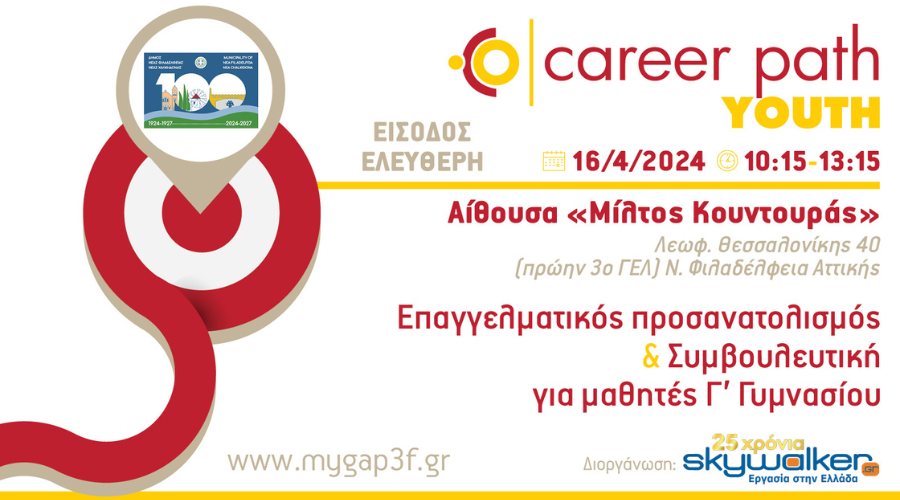 Το skywalker.gr – Εργασία στην Ελλάδα, στο πλαίσιο των πρωτοβουλιών που αφορούν την εκπαίδευση, σε συνεργασία με τον Δήμο Νέας Φιλαδέλφειας – Νέας Χαλκηδόνας, διοργανώνει τη δράση Career Path Youth την Τρίτη 16 Απριλίου και ώρες 10:15-13:15, στην αίθουσα «Μίλτος Κουντουράς», Λεωφ. Θεσσαλονίκης 40 (πρώην 3ο ΓΕ.Λ.), Ν. Φιλαδέλφεια Αττικής.