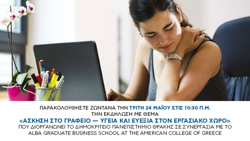 Tην Tρίτη 24 Μαΐου, το Δημοκρίτειο Πανεπιστήμιο Θράκης σε συνεργασία με το ΑLBA Graduate Business School at the American College of Greece παρουσίασε στα πλαίσια του Ευρωπαϊκού προγράμματος «Θεραπευτική άσκηση στον εργασιακό χώρο»- THEWS (ERASMUS+ «Στρατηγικές Συμπράξεις για την Ανώτατη Εκπαίδευση») το οποίο συγχρηματοδοτείται από το ΙΚΥ και την Ε.Ε., ένα δωρεάν καινοτόμο εργαλείο το οποίο σχεδιάστηκε και υλοποιήθηκε από καθηγητές Πανεπιστημίου και εξειδικευμένους ορθοπεδικούς γιατρούς με σκοπό την βελτίωση της ποιότητας ζωής και εργασίας των εργαζομένων. Στελέχη Διοίκησης Προσωπικού και στελέχη Εταιρικής Κοινωνικής Ευθύνης, ενημερώθηκαν για την ηλεκτρονική πλατφόρμα θεραπευτικής άσκησης (thews-platform.eu) όπου μπορούν να έχουν πρόσβαση δωρεάν οι εργαζόμενοι τους στις ειδικά σχεδιασμένες ασκήσεις για το γραφείο. Μακροπρόθεσμα, στόχος του έργου είναι οι ίδιες οι επιχειρήσεις να υιοθετήσουν εκπαιδευτικά προγράμματα θεραπευτικής άσκησης με εξειδικευμένους καθηγητές φυσικής αγωγής, έτσι ώστε να αντιμετωπιστούν αποτελεσματικά οι μυοσκελετικές διαταραχές που προέρχονται από την καθιστική εργασία στον χώρο του γραφείου. Η υγεία και ευεξία των εργαζομένων θα πρέπει να μπει πλέον δυναμικά στην ατζέντα δραστηριοτήτων των Υπεύθυνων Ανθρώπινου Δυναμικού. Όταν ένας στους δύο εργαζόμενους παραπονιέται ότι πονάει η πλάτη του και η μέση του εξαιτίας της καθιστικής εργασίας και της λάθος στάσης σώματος, είναι σημαντικό οι επιχειρήσεις να δράσουν άμεσα και να κατανοήσουν ότι η υγεία των εργαζομένων τους αποτελεί βασική προϋπόθεση για την παραγωγικότητα της εταιρείας και την ευημερία της. Το κόστος για την εταιρεία, για τον εργαζόμενο και κατ’ επέκταση για την δημόσια υγεία είναι πλέον δυσβάστακτο. Για περισσότερες πληροφορίες για το καινοτόμο εργαλείο μπορείτε να επικοινωνήσετε με την καθηγήτρια κα. Αναστασία Μπενέκα, ΣΕΦΑΑ ΔΠΘ.