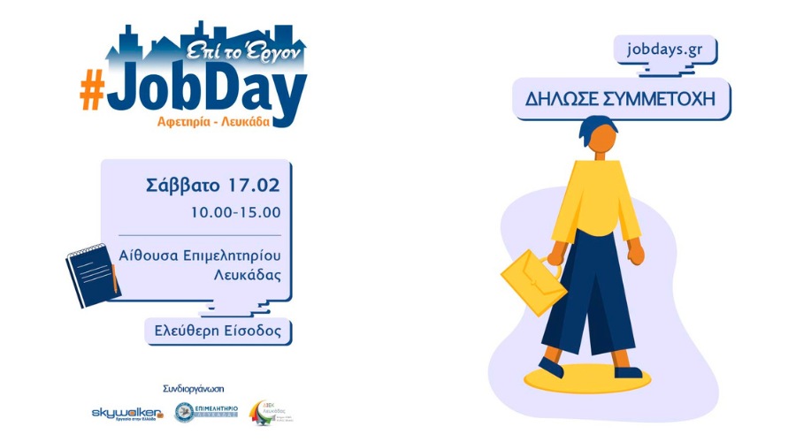Το #JobDay Αφετηρία – Λευκάδα απευθύνεται σε όποιον αναζητά εργασία ή σκέφτεται να αλλάξει επάγγελμα και θέλει να διευρύνει τις γνώσεις και τις δεξιότητές του δημιουργώντας ένα καλύτερο βιογραφικό και λαμβάνοντας όλες εκείνες τις πληροφορίες που θα τον βοηθήσουν να γίνει περιζήτητος στην αγορά εργασίας.